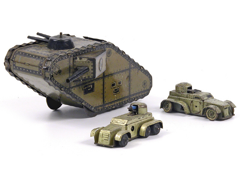 longueur 22 cm - moteur à clef (fonctionne de manière aléatoire) - en action, le véhicule avance tandis qu'un soldat sort par une trappe - traces d'oxydation - ouverture supérieure ressoudée