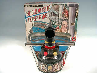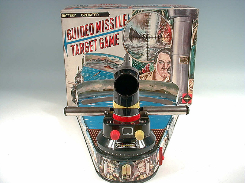 longueur 36 cm - mécanisme à piles (fonctionne) - en action, les commandes du périscope permettent de viser un bateau (manquant) & de le couler - lampe clignotantes & bruiteur