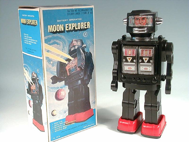 hauteur 29 cm - moteur à piles (fonctionne de manière aléatoire) - le mécanisme fait avancer le robot & fait sortir des mitraillettes du ventre - bruiteur