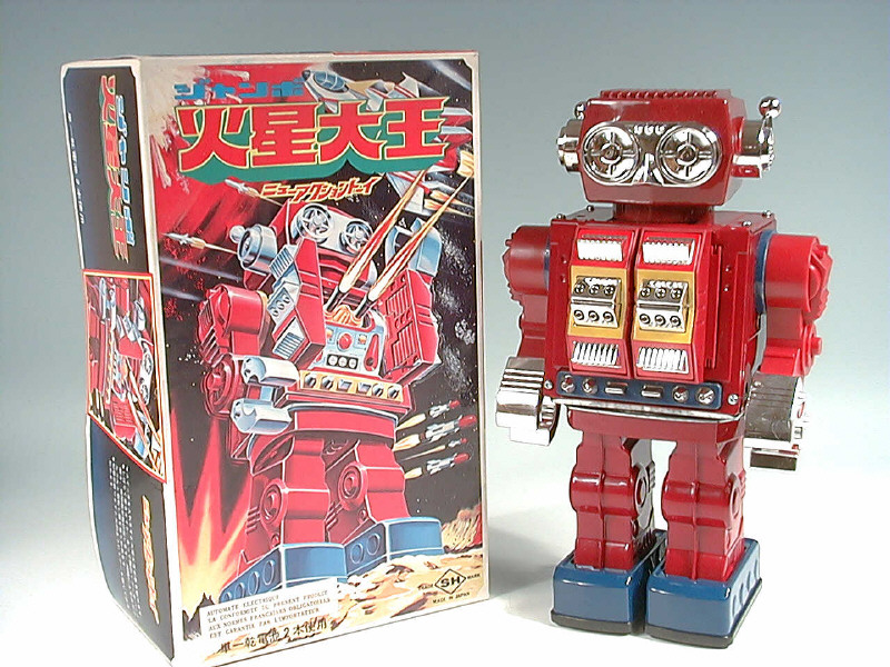 hauteur 30 cm - moteur à piles (à revoir) - le mécanisme fait avancer le robot & déclanche les mitrailleuses qui sortent du corps - avec bruitage & lampes clignotantes - corps & jambes en tôle - cale de boîte