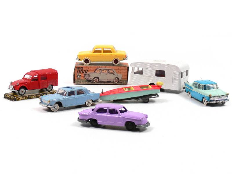états de 'A' à 'D' - miniatures reproduisant les modèles : PEUGEOT, PANHARD, SIMCA, CITROËN, ROCCA & DIGUE - on y retrouve notamment les marques : NOREV, MINIALUXE & ECF - une voiture avec boîte & une autre avec socle en carton - bateau avec remorque incomplets