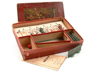 dimensions : 34 x 28 cm - contient : 6 galopeurs avec jockey, un mât, 7 haies, 2 barrières, une rivière, 2 dés, une règle du jeu & un tapis de jeu en carton - petites retouches