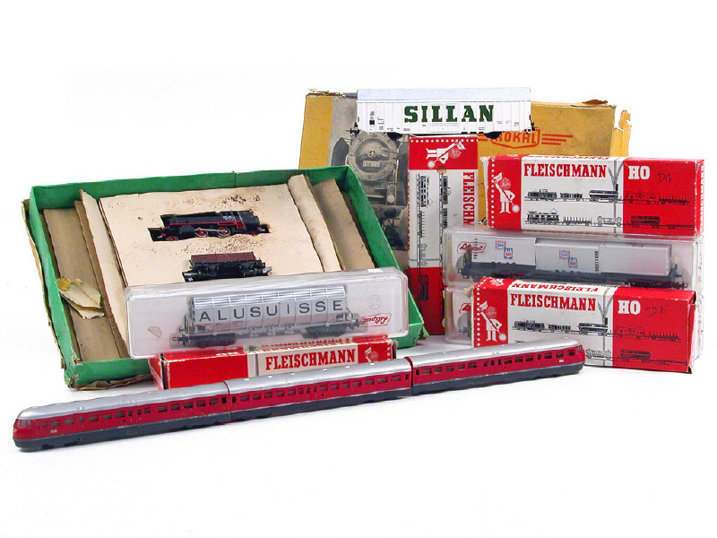 comprend : un coffret avec une locomotive-tender & 3 wagons-tombereaux (état D.e), un autre coffret avec un autorail à 3 éléments (état D.e) & 8 wagons (état A.c) - on y retrouve les marques : FLEISCHMANN, LILIPUT & ROKAL