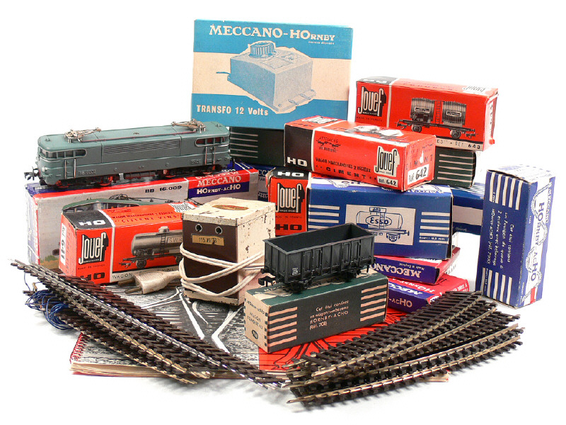 comprend : une motrice BB.16009 (avec notice), 2 voitures de voyageurs, 7 wagons de marchandises, 2 transformateurs (avec notice) dont un de la marque SABIR (en état 'D' sans boîte), une boîte de 12 rails droits, 2 d'aiguillages, un ensemble de rails & un guide 'PLANS DE RESEAUX' - on y retrouve les marques : JOUEF & HORNBY 'HO'