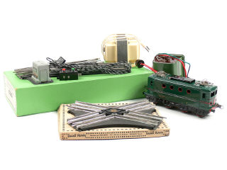attelage incomplet - cache supérieur & parties basses repeintes - manque ressort de rappel du frotteur - on y joint un aiguillage talonnable droit télécommandé en boîte, un croisement oblique en boîte, un transformateur n°0 & un autre de la marque PALMIERI-ROBIN