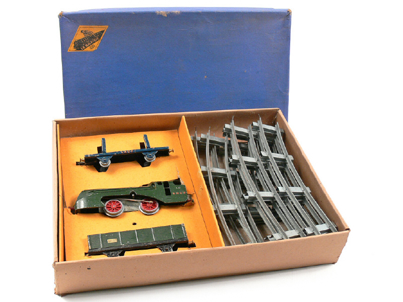 contient : une locomotive vapeur type 020 (moteur à clef fonctionne), un wagon-plateau à ranchers, un wagon-tombereau & 11 rails courbes
