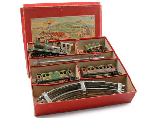contient : une locomotive à vapeur type 220 (70) avec tender (71), une voiture de voyageurs avec lanterneaux (73), un fourgon à bagages (74), 2 chariots à bagages, 6 rails courbes, 4 rails droits (dont un avec signal d'arrêt) & une clef - locomotive avec moteur à clef (fonctionne) - avec notice collée au verso du couvercle de boîte - illustration de couvercle de boîte superbe ! - FABRICATION DE 1915 DANS UN ETAT DE PRESENTATION EXCEPTIONNEL !