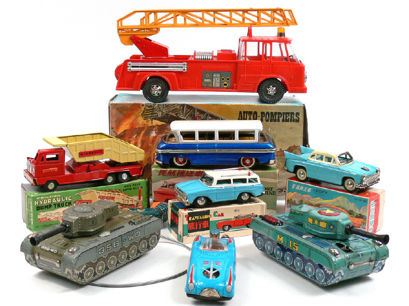 états de 'A' à 'C' - comprend : un camion-benne, un autocar d'aéroport, 3 voitures, 2 chars & un camion de pompiers - on y retrouve notamment les marques : JOUSTRA & TM - 6 modèles avec boîtes - quelques petits manques