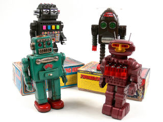 hauteur 30,5 cm - moteur à piles (fonctionne) - en action, le robot avance puis il lève les bras, tandis que des canons au creux de ses mains se mettent à tirer - avec bruiteur