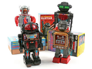 hauteur 26,5 cm - moteur à piles (fonctionne) - en action, le robot avance puis s'arrête tandis que son scaphandre s'ouvre en 2 laissant apparaître une tête de dinosaure qui ouvre sa gueule lumineuse - un mécanisme défectueux - avec bruiteur & lumières sur le bas du torse - manque la hache