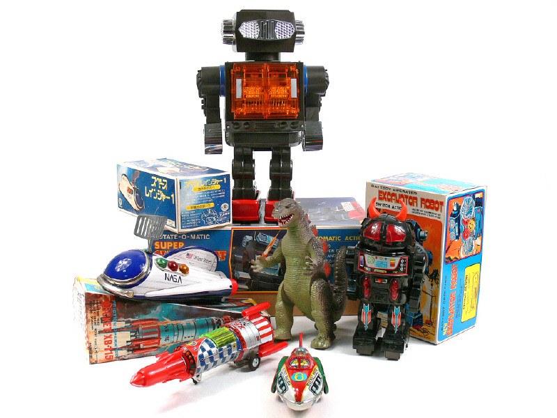 hauteur 26,5 cm - moteur à piles (fonctionne) - en action, le robot avance puis s'arrête tandis que son scaphandre s'ouvre en 2 laissant apparaître une tête de dinosaure qui ouvre sa gueule lumineuse - avec bruiteur & lumières sur le bas du torse - manque la hache - boîte non d'origine