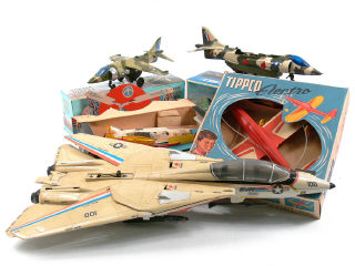 longueur 38 cm - moteur à piles (fonctionne) - en action, l'avion avance puis simule un décollage & un atterrissage à la verticale
