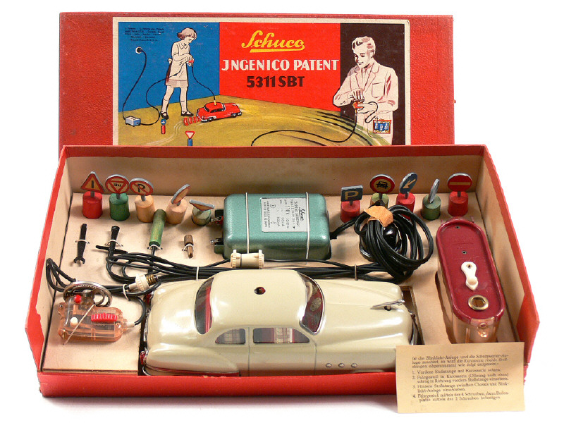 dimensions : 37 x 21 cm - contient : une voiture, un boîtier de piles, une télécommande à distance, un transformateur, des panneaux de gymkhana, des outils, un fiche d'indications & un sachet de visseries - modèle original qui n'a jamais été utilisé - SUPERBE !