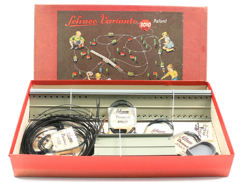 contient : 2 pistes, un pont, un aiguillage, une remorque & différents câblages - la plupart des éléments est encore ficelée sur le socle de boîte