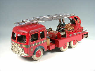 longueur 45 cm - moteur à clef (fonctionne) - direction - avec son chauffeur & ses 4 pompiers - fabrication de 1952 - SUPERBE !