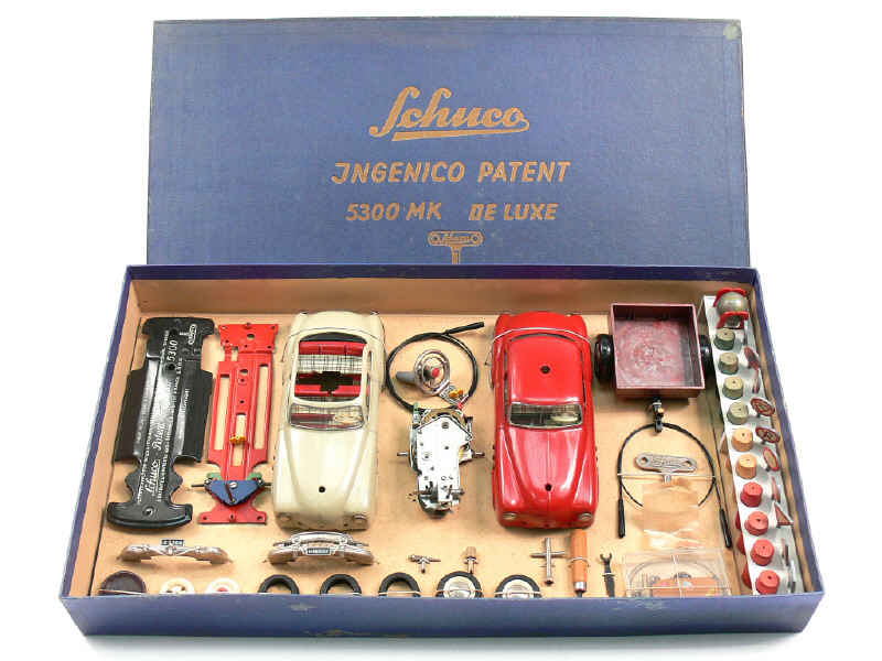 dimensions : 54 x 31 cm - contient : 2 carrosseries (un coupé & une découvrable), un châssis, des éléments de carrosserie, un câble de téléguidage, une remorque à 2 roues, des plots avec panneaux de signalisation & des accessoires - permet la construction de l'une ou de l'autre des 2 carrosseries avec ces accessoires - tous les éléments sont ficelés sur le carton de fond de boîte & n'ont jamais été montés - SUPERBE !