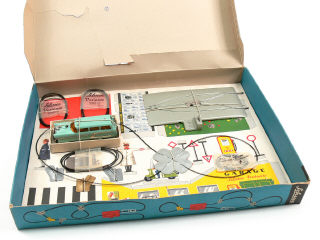 contient : un break avec moteur à piles (à revoir), des câblages, une piste & des accessoires - tous les éléments sont fixés sur un fond de boîte représentant des éléments de décor à découper