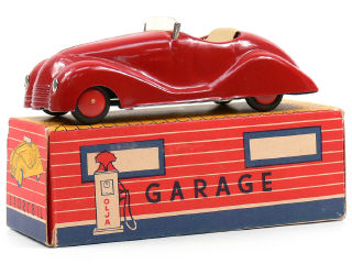 longueur 15 cm - moteur à clef (fonctionne) - avec direction - traces d'oxydation sur le plancher - la boîte représente un garage