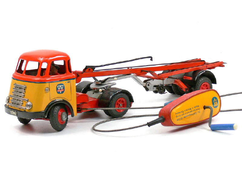 longueur 43,5 cm - système de téléguidage mécanique (fonctionne) - clignotants à piles (une ampoule à revoir) - manque container, une rampe d'accès & quelques petits accessoires sur la remorque - SUPERBE REALISATION !