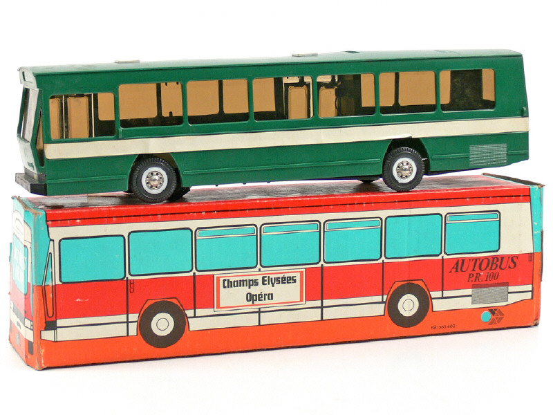 longueur 37 cm - moteur à piles (fonctionne) - la mise en marche de l'autobus s'effectue par l'insertion d'un ticket de R.A.T.P. (manquant) dans une fente située sur le toit - en action, l'autobus avance en contournant les obstacles - manque autocollant de direction de cartouche avant