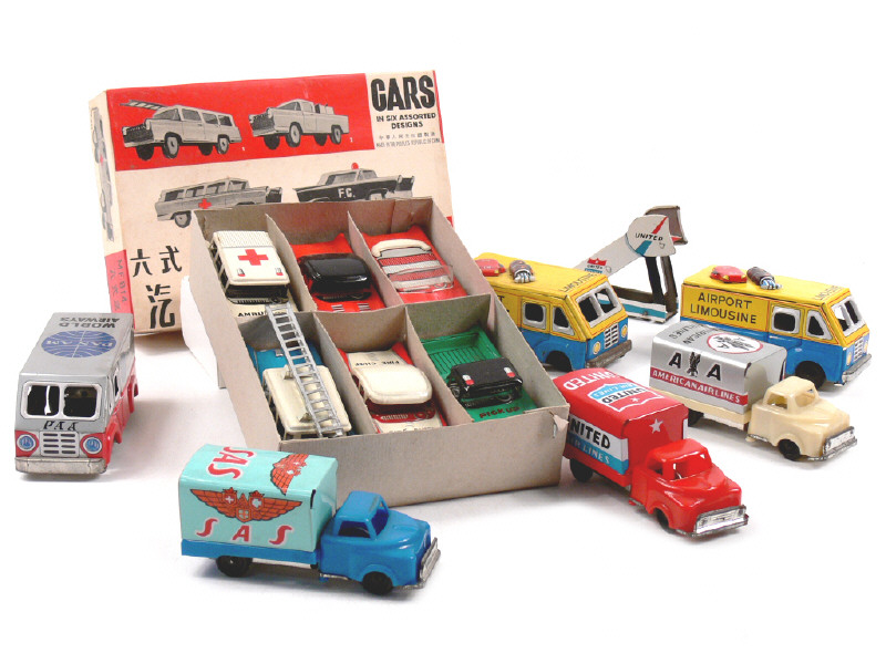 comprend : un break de dépannage, une ambulance, un pick-up, une voiture de pompiers, un coupé & un cabriolet - moteurs à friction (fonctionnent) - on y joint 6 véhicules en tôle lithographiée & plastique en état 'B' de fabrication japonaise représentant des véhicules d'aéroport (un modèle en état 'F')