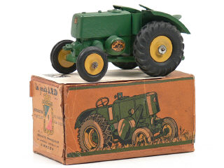 version avec décalques latéraux ovales - ce rarissime promotionnel a été réalisé en 1950 à la demande de la SOCIETE FRANCAISE VIERZON (Cher) - on y joint la carte de visite de Monsieur P.E. TRONQUIT de la société SFV (cette carte était vraisemblablement remise aux heureux acquéreurs du tracteur) - une petite trace d'humidité sous le pot d'échappement - ETAT EXCEPTIONNEL POUR UN MODELE AUSSI RARE !