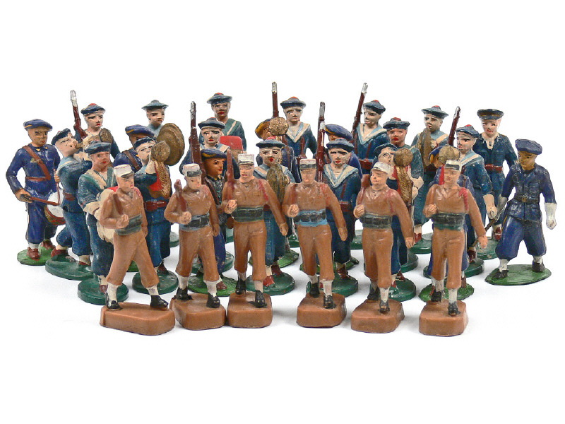 états de 'B' à 'C' - comprend : 7 chasseurs alpins, 16 marins & 6 légionnaires - on y retrouve les marques STARLUX & JIM - petits manques - conditions 'B' to 'C' - includes the aforementioned models and makes: 7 alpine soldiers, 16 marines and 6 legionnaires - incomplete