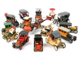 états de 'A' à 'R' - miniatures reproduisant les modèles : HAUTIER, PEUGEOT, GOBRON BRILLIE, CITROËN, DELAHAYE, FORD, SIMPLEX, LANDAULET PACKARD, DEDION BOUTON, ROCHET-SCHNEIDER, SCOTTE, PANHARD & LEVASSOR, GUONOT- 2 voitures de la marque SAFIR, une de la marque MATCHBOX & une autre de la marque PRECISIA - petits manques - un modèle avec métal fatigue - conditions 'A' to 'R' - includes the aforementioned models - 2 cars made by SAPHIR , one by MATCHBOX & one by PRECISIA - incomplete - one model with metal fatigue