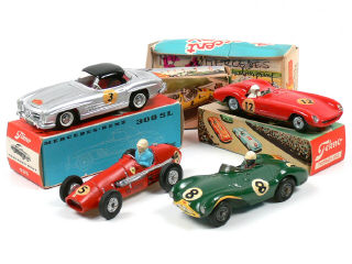 miniatures reproduisant les modèles : FERRARI, MERCEDES & ASTON MARTIN - on y retrouve les marques : TEKNO & CRESCENT TOY - une boîte non d'origine - includes the aforementioned models and makes - one non-original box