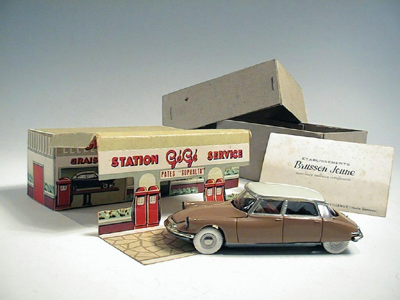 PROMOTIONNEL ' PÂTES SUPRALTA' - modèle version luxe avec moteur à friction, plaques d'immatriculation 87-GG-56, offert par les Etablissements BRUSSON JEUNE à VILLEMUR (Haute-Garonne), à partir de 1956, contre des points représentant un cuisinier à découper sur les paquets de pâtes - le lot comprend la boîte en forme de garage 'STATION GéGé SERVICE' 'PATES SUPRALTA', la sur-boîte coffret grise & la carte d'accompagnement 'avec leurs meilleurs compliments...' - Cette entreprise est toujours existante mais le département 'Pâtes' a été racheté par 'PANZANI' dans les années 60, aujourd'hui les Etablissements BRUSSON JEUNE produisent des biscottes et du pain de mie - CE MODELE RARISSIME EST EN ETAT EXCEPTIONNEL !