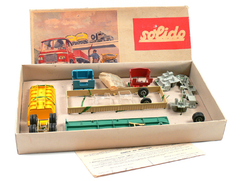 contient : 2 cabines de WILLEME & BERNARD, châssis, benne, remorque-plateau à ridelles, essieux & accessoires - ensemble complet ficelé sur la cale de fond de boîte - avec notice - quelques légères traces d'oxydation sur un axe de roues - SUPERBE !