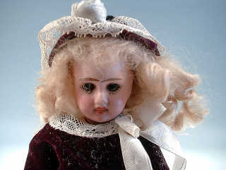 tête en porcelaine marquée en creux d'une ancre, yeux fixes bruns, bouche fermée, corps en composition raide, perruque blonde en mohair, robe en velours violet, chapeau et chaussures assorties. H : 22 cm
