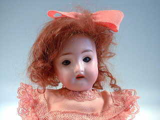 tête en biscuit marquée en creux " 15 ", yeux dormeurs bleus, bouche ouverte sur une rangée de dents, corps en composition raide, perruque auburn en mohair, robe abricot, chaussures noires et chaussettes. H : 25 cm