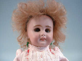 (petit fêle au front), marquée en creux " DEP " T.5, yeux dormeurs bleus, bouche ouverte sur une rangée de dents, oreilles percées, corps de femme en composition articulé, étiquette bleue " Bébé Jumeau Diplôme d'Honneur ", perruque blonde en mohair, jupe rose et corsage rose et blanc. H : 49 cm