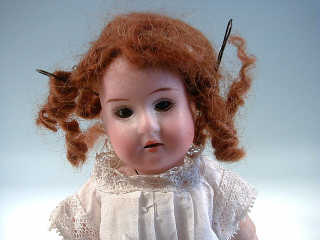 tête en porcelaine marquée en creux " 1909 DEP R 16/0 A ", yeux fixes bruns, bouche ouverte sur une rangée de dents, corps en composition articulé, perruque rousse, chemise blanche. H : 20 cm
