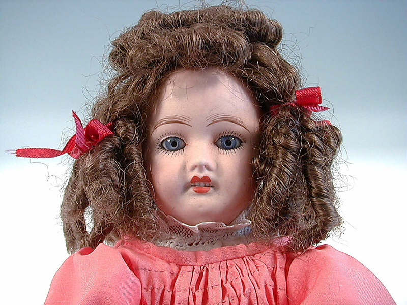 tête en porcelaine marquée en creux " Fabrication Française France J.B. " T.3, yeux fixes bleus en verre, bouche ouverte sur une rangée de dents, oreilles percées, corps en composition articulé, perruque brune, cheveux naturels, sous-vêtements linon et Valenciennes, robe rose à smocks, chaussures et chaussettes blanches. H : 34 cm