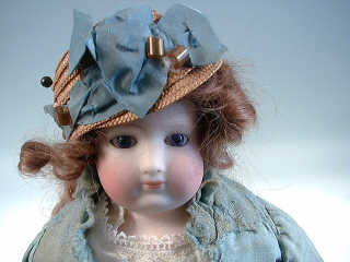 tête fixe et collerette en biscuit (restauration à la collerette), yeux fixes bleus en verre, bouche fermée, corps raide en tissu, bras en peau, (mains " moufles "), sous-vêtements, costume d'origine XIXéme en lainage bleu et velours marron (restaurations au costume), chapeau paille et ruban bleu, chaussures noires et bas blancs. H : 37 cm
