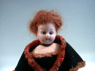 " La Diseuse de Bonne Aventure ", tête en biscuit marquée en creux " 253 ", yeux fixes bruns, bouche fermée, collerette en composition, yeux fixes bruns, bouche fermée, corps en peau, bras et jambes en bois, perruque auburn, jupon fait de messages en papier plié, jupe noire et châle en velours rouge et noir. H : 22 cm