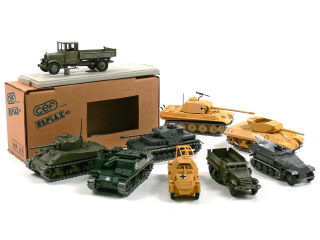 comprend : PANTHER G, SDKFZ 251, SDKFZ 232, HALF-TRACK, SHERMAN, M7 PRIEST, M10 & PANZER IV - quelques jantes légèrement fondues - petits manques - on y joint un camion-plateau de la marque CEF avec boîte