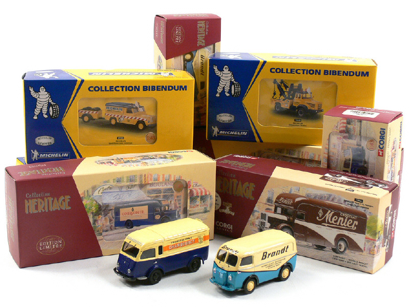 série 'CORGI HERITAGE' - miniatures reproduisant les modèles : BERNARD, BERLIET, LAND ROVER, PEUGEOT & RENAULT - avec certificats d'éditions limitées numérotés & sachets d'accessoires - 2 véhicules de la série 'COLLECTION BIBENDUM'