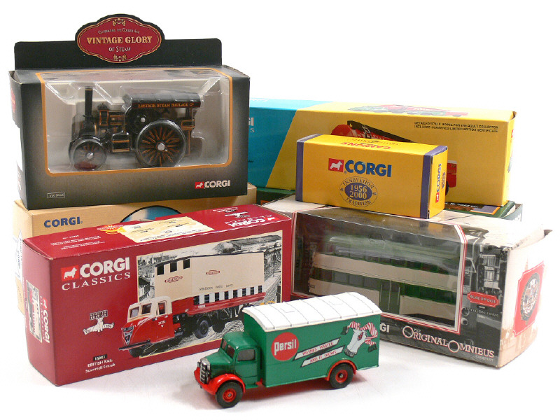 CORGI TOYS (GB) Ensemble de 5 camions, 2 utilitaires, un tramway & une machine à vapeur