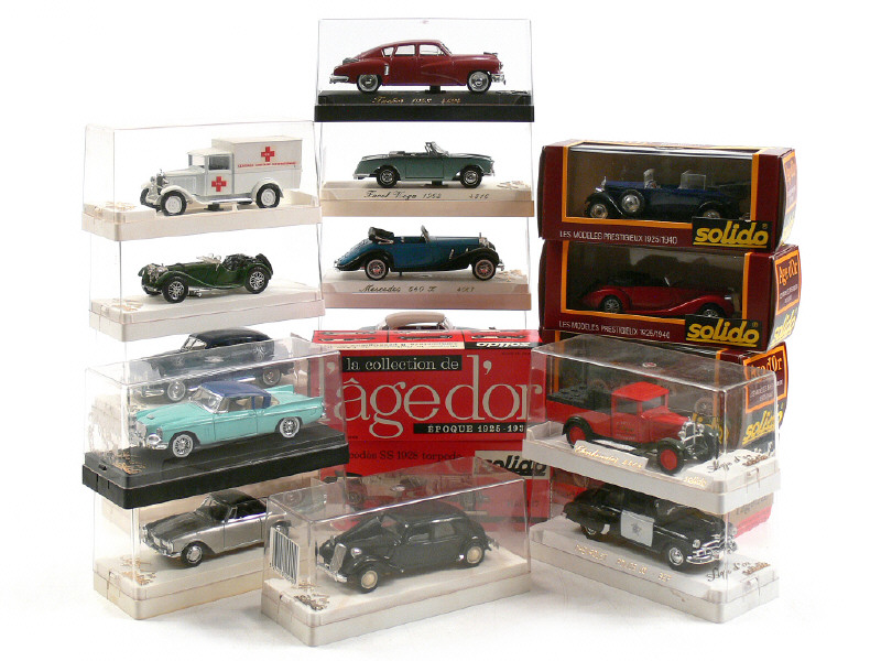 série 'AGE D'OR' - miniatures reproduisant les modèles : CHEVROLET, MERCEDES, FACEL VEGA, TUCKER, CITROËN, BUICK, FIAT, DELAHAYE, DUESENBERG, CORD, VOISIN, STUDEBAKER, JAGUAR & CHRYSLER