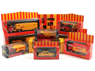 VEREM (FRANCE) Ensemble de 10 véhicules, une caravane, figurines & accessoires du cirque PINDER rouge & jaune