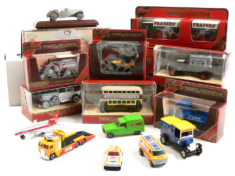 états de 'A' à 'D' - miniatures reproduisant notamment les modèles : MERCEDES, LEYLAND, FORD, FODEN, CHEVROLET, DOUGLAS, PRESTON, JAGUAR, KENWORTH, RENAULT, CADILLAC, SIMPLEX, AUSTIN, BMW & ROSENGART - 6 véhicules sans boîte, 18 de la série MODELS OF YESTERYEAR - petits manques - un utilitaire de marque SOLIDO
