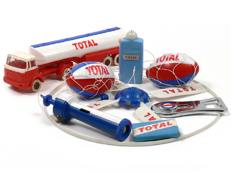 version sans moteur à friction - traces d'oxydation sur les axes de roues - on y joint 2 ballons de rugby en plastique, une savonnette sous emballage d'origine, un décapsuleur, une lampe électrique & un jeu à hélice en plastique de la marque TOTAL