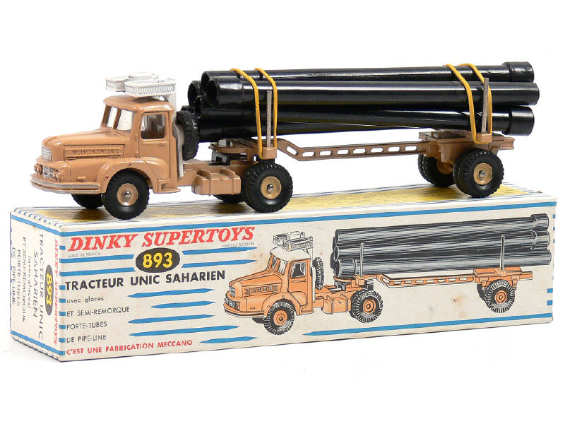 DINKY TOYS (FRANCE) 893 UNIC Saharien transport de pipe-lines (version avec jantes concaves & remorque ajourée) sable & blanc
