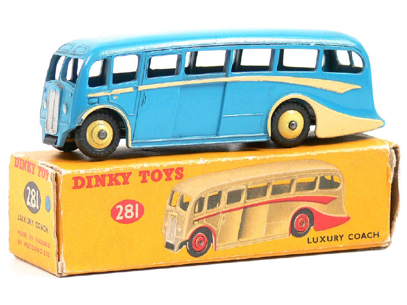 DINKY TOYS (GB) 281 LUXURY Coach bleu vif & crème, jantes jaune pâle