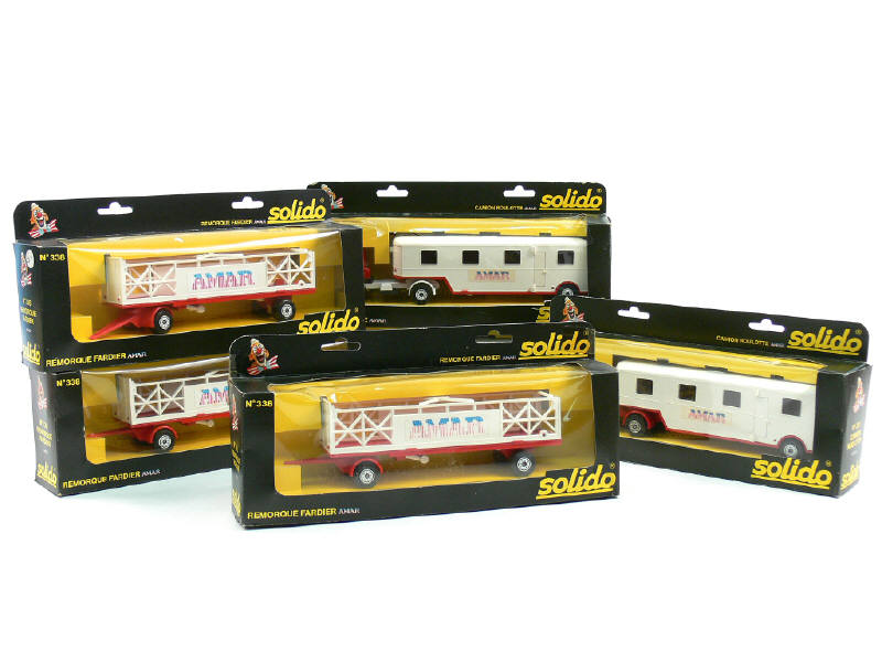 SOLIDO (FRANCE) Ensemble de 3 remorques, 2 camions-roulottes & un camion transport d'animaux 'AMAR' blanc & rouge