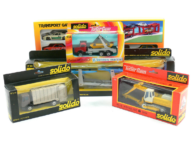 SOLIDO (FRANCE) Ensemble de 4 camions, 6 voitures & un engin de travaux publics
