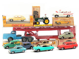 états de 'A' à 'C' - comprend : CITROËN 2CV AZ, CITROËN DS19 cabriolet, CITROËN 2CV fourgonnette 'TEPPAZ', CITROËN TRACTION 11A (manque malle arrière), CITROËN SM, PEUGEOT 204 coupé, PANHARD PL17 break, SIMCA MARLY ambulance, CITROËN AMI 8, RENAULT R86 (avec manques & direction fendue) & BERLIET TBO 15 porte-autos - 6 modèles sans boîte